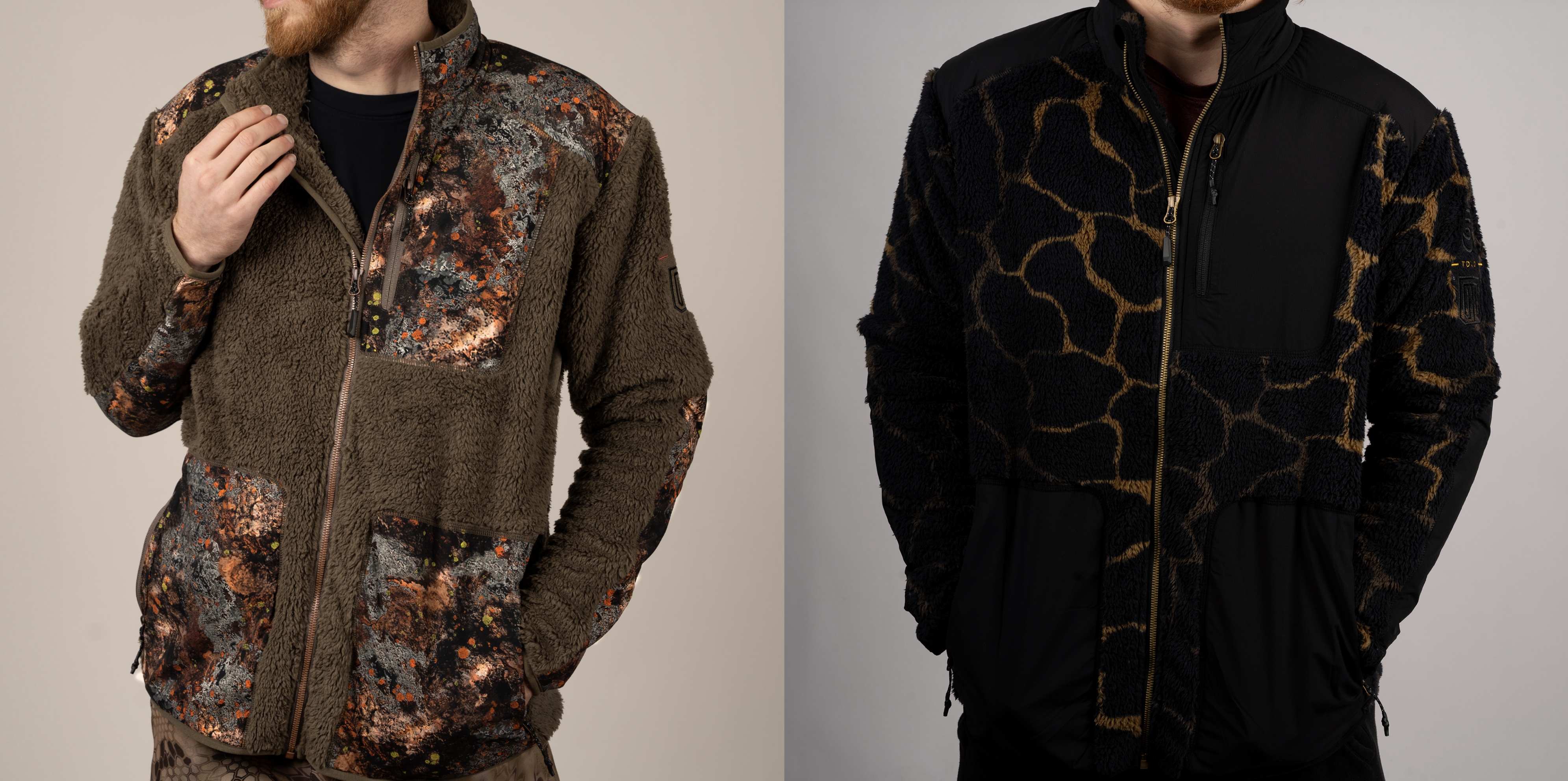 - 100% Polyester High-pile Sherpa Fleece; 87% Nylon/ 13 % Spandex 30D Ripstop; 60% Merino Wool/ 40% Polyester Grid-knit Fleece
